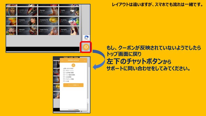 それでも入金できないという場合は、ライブチャットでサポートに相談してみてください。