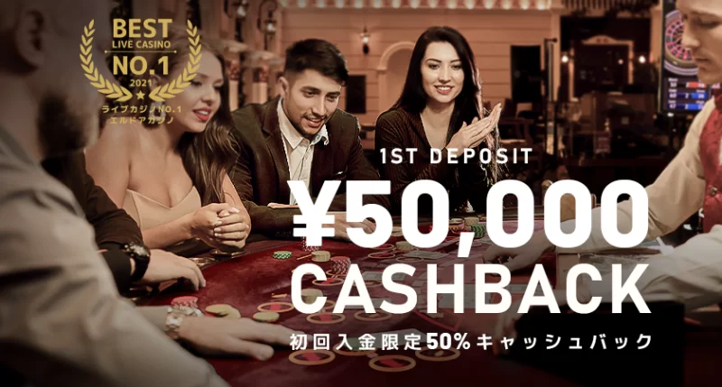 エルドアカジノでは、初めての入金でプレイを行い、残念にも勝てなかった場合に初回入金額の50%(最大50,000円)をキャッシュバックしてくれます。