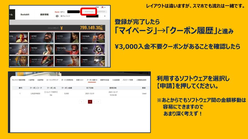 ④登録が完了したら「マイページ」→「クーポン履歴」と進み、入金不要ボーナス\3,000円を申請しましょう。