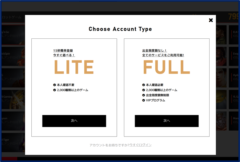 ②LITEとFULLがありますが、入金不要ボーナスをゲットするためにはFULLを選択します。