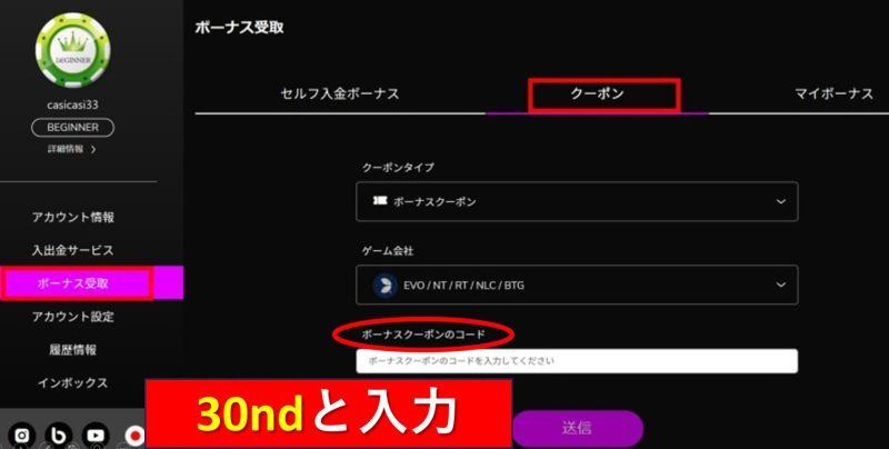 ⑤ログインが完了したら、ユーザー名をクリックした後、「ボーナス受取」→「クーポン」と進み、クーポンタイプはボーナスクーポンを選択します。さらにボーナス入金先のゲーム会社を選択(あとから金額の移動は可能)し、最後にボーナスクーポンのコードのところに30ndと入力し送信して完了です。